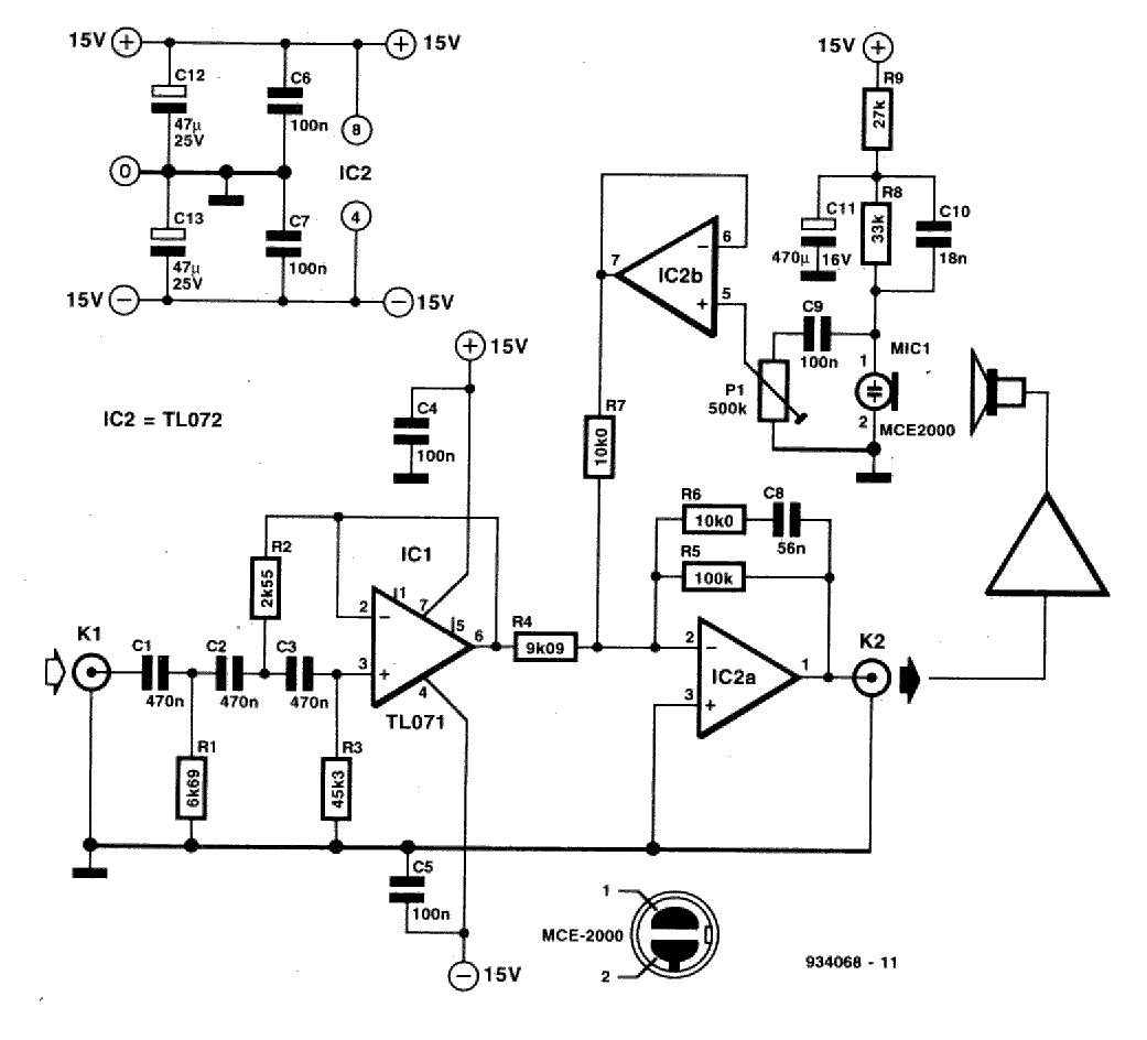 Częstotliwość, do której sygnał mikrofonu jest kompensowany, jest określona przez R8-C10-P1. Ta stała czasu musi być równa R6-C8. Przedstawiany układ ma wzmocnienie ok. 20dB dla częstotliwości wyższych od 20Hz. Większość głośników nie działa przy tak niskiej częstotliwości, do układu włączono więc filtr Butterwortha trzeciego rzędu, o częstotliwości granicznej 37kHz. Częstotliwość ta może być zmieniana przez zmianę pojemności C1, C2 i C3. Filtr ten zapobiega wzbudzaniu głośnika częstotliwościami, których nie może on odtwarzać. Korektor jest szczególnie użyteczny w aktywnych kolumnach głośnikowych. Należy upewnić się, czy faza głośnika jest odwrócona, aby uniknąć dodatniego sprzężenia zwrotnego. Można to zrobić dodając przed K2 bufor odwracający.